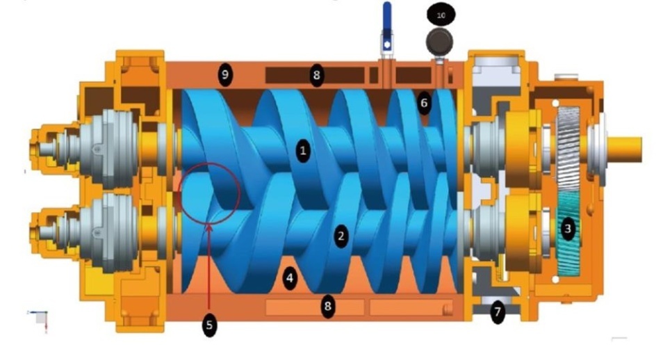 干式螺桿真空泵的工作過程可分為吸氣、壓縮和排氣三個過程。如圖所示,干式螺桿真空泵內(nèi)裝有一對平行的螺旋狀的轉(zhuǎn)子(1和2),其中一件轉(zhuǎn)子的旋轉(zhuǎn)方向為右旋,另一件為左旋。兩個轉(zhuǎn)子在泵體(9)內(nèi)通過一對齒輪(3)保持同步反向旋轉(zhuǎn)。轉(zhuǎn)子與轉(zhuǎn)子之間、轉(zhuǎn)子與泵體之間沒有磨擦且保持一定的間隙,兩個轉(zhuǎn)子與泵體之間形成了密封腔(4),密封腔的個數(shù)等于轉(zhuǎn)子的螺旋圈數(shù)。兩個轉(zhuǎn)子在按圖中方向旋轉(zhuǎn)時,與吸氣口(5)相連的密封腔的空間逐漸變大,氣體被吸入并被傳送到排氣側(cè),排氣側(cè)的密封腔(6)空間在旋轉(zhuǎn)過程中逐漸變小,氣體被壓縮到排氣口(7)。長時間運轉(zhuǎn)時需向泵體及端蓋的夾套(8)內(nèi)通入適量的冷卻水以對泵進行冷卻。因壓縮熱主要在排氣側(cè)(6)產(chǎn)生,為了充分冷卻轉(zhuǎn)子,在多數(shù)工況下可以將適量的空氣或其它合適的氣體通過摻氣口(10)導入泵腔內(nèi)。