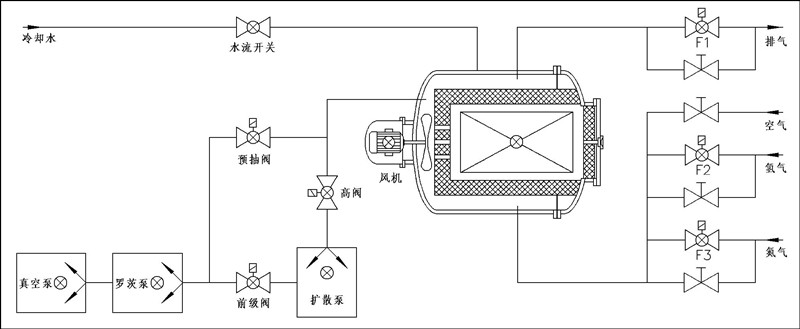 (1)、爐體:爐體由爐蓋、筒體組成,主爐體是一個臥式放置的爐體。其中爐體(爐殼、爐門)采用雙層爐壁結構,夾層中通水冷卻。爐門為左開式,在其上邊設計有一個供操作者觀察的石英玻璃窗。真空管道上設計有防止破壞真空泵組正常工作的過濾器。兩個加熱供電連接線電極分別裝在爐體左右兩側。爐體外上部裝有爐內溫度測量接線機構、接點式真空壓力表和出氣體管道。爐體外下部裝有進氣體管道。爐體內裝有加熱體、保溫層、工件支承體(料臺)等。